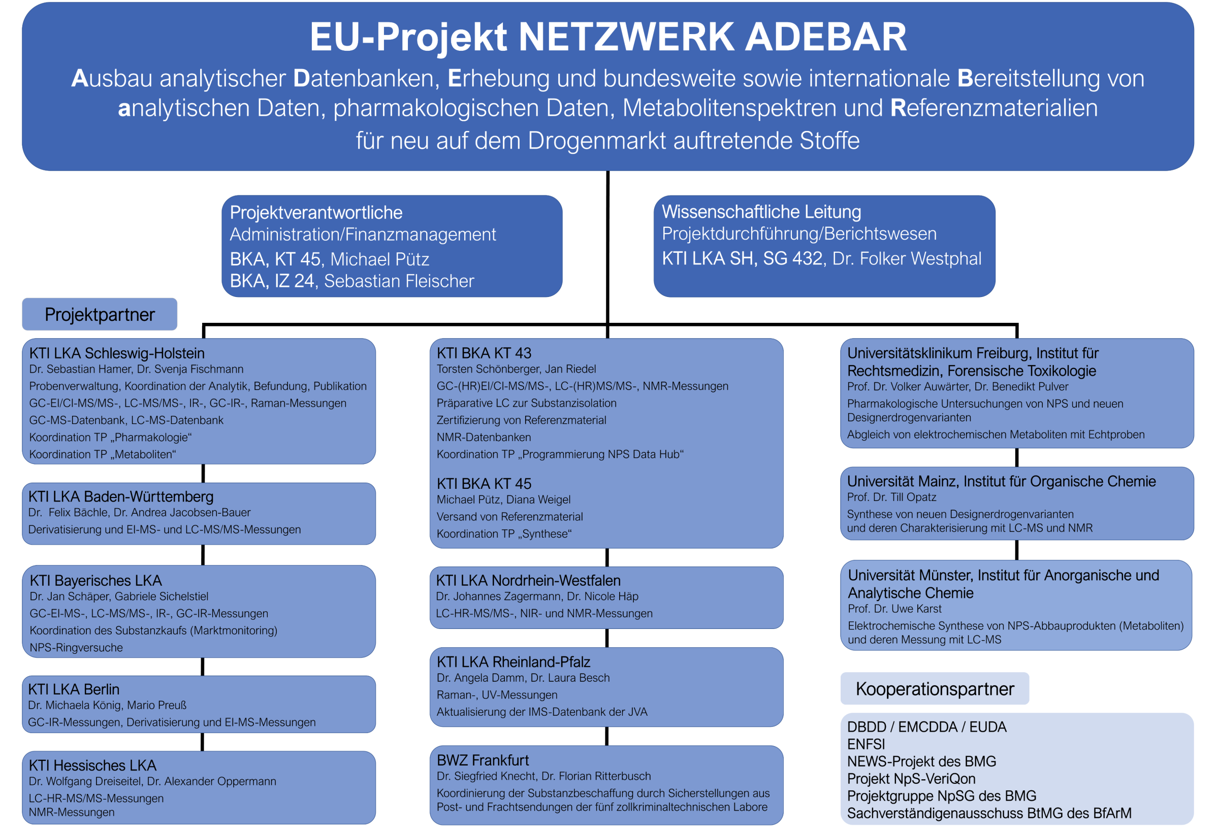 Neun kriminaltechnische Institute der deutschen Polizei und des Zolls sind in den Analyseprozess eingebunden. Die drei Universitäten füllen die Bereiche Synthese, pharmakologische Untersuchung und Metabolitenerforschung von NPS aus. Jeder analytische Projektpartner erfüllt einen bestimmten Aspekt innerhalb des Kompetenznetzwerks. Die wissenschaftliche Zentralstelle des Projekts befindet sich in Kiel beim Landeskriminalamt Schleswig-Holstein, wo auch der Großteil der analytischen Datenerfassung, -verarbeitung und -veröffentlichung stattfindet. Wie bei den anderen Kriminaltechnischen Instituten in Deutschland sind auch in Kiel nicht alle Analysetechniken verfügbar. Daher werden im Rahmen des ADEBAR-Projekts die analytischen Möglichkeiten aller Projektpartner genutzt, um einen umfassenden analytischen Datensatz zu erhalten. Die Vielzahl der mit unterschiedlichen Analysemethoden erhobenen analytischen Daten gestattet einen weiten Anwendungsbereich. Sie werden in universelle Austauschformate konvertiert und allen deutschen Polizei- und Zolluntersuchungslaboren sowie auch europa- und weltweit kostenfrei zur Verfügung gestellt. Das Fachwissen der verschiedenen Projektpartner wird auch zur Entwicklung neuer Methoden für die Quantifizierung von NPS genutzt.